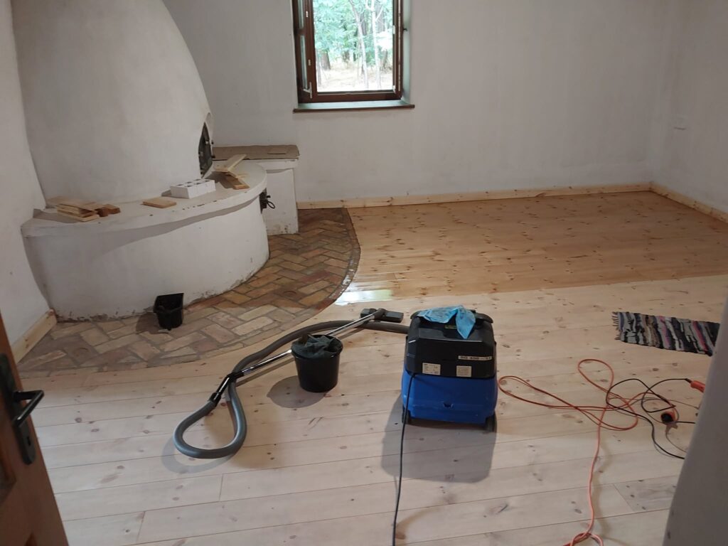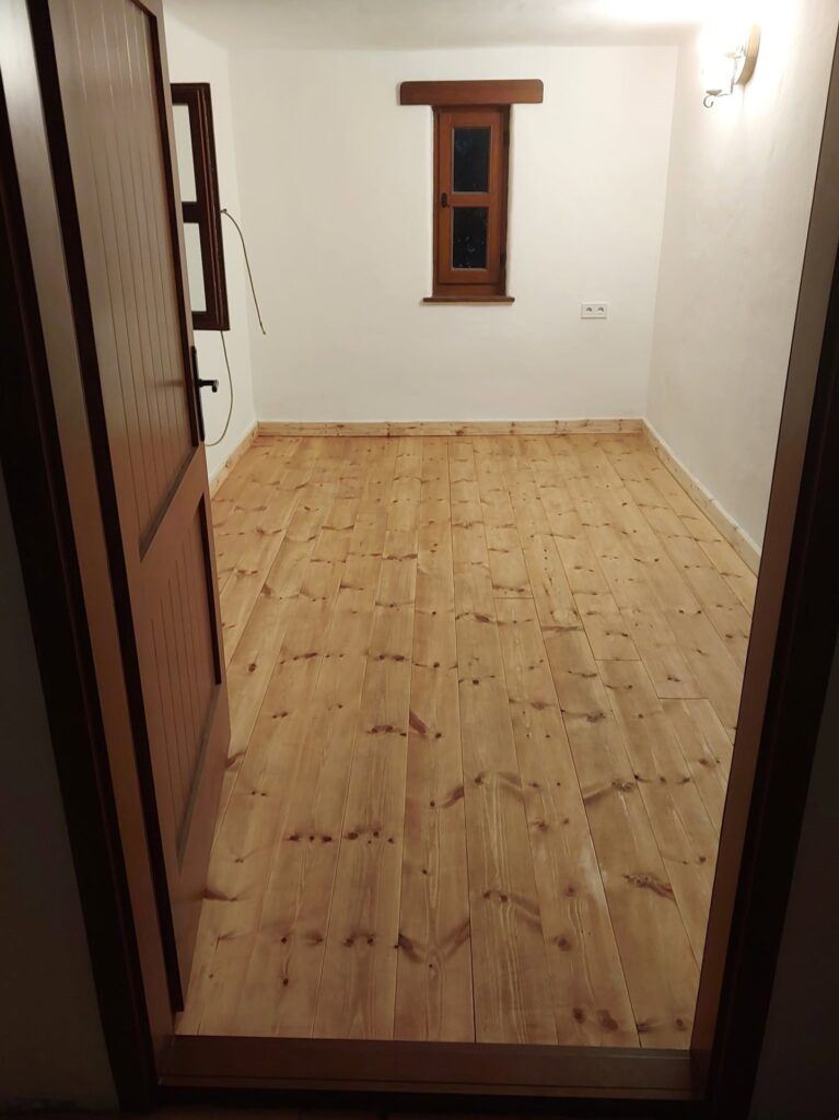 Dușumeaua aleasă din oferta noastră, datorită execuției cu îmbinare pe lungime, permite realizarea lucrării practic fără pierderi de material. Aceasta nu este doar o soluție economică și prietenoasă cu mediul, ci a făcut posibilă și montarea perfectă a întregii suprafețe, fără rosturi vizibile. Rezultatul este o suprafață de pardoseală estetică, curată și de înaltă calitate, demnă de spiritul unei locuințe tradiționale.