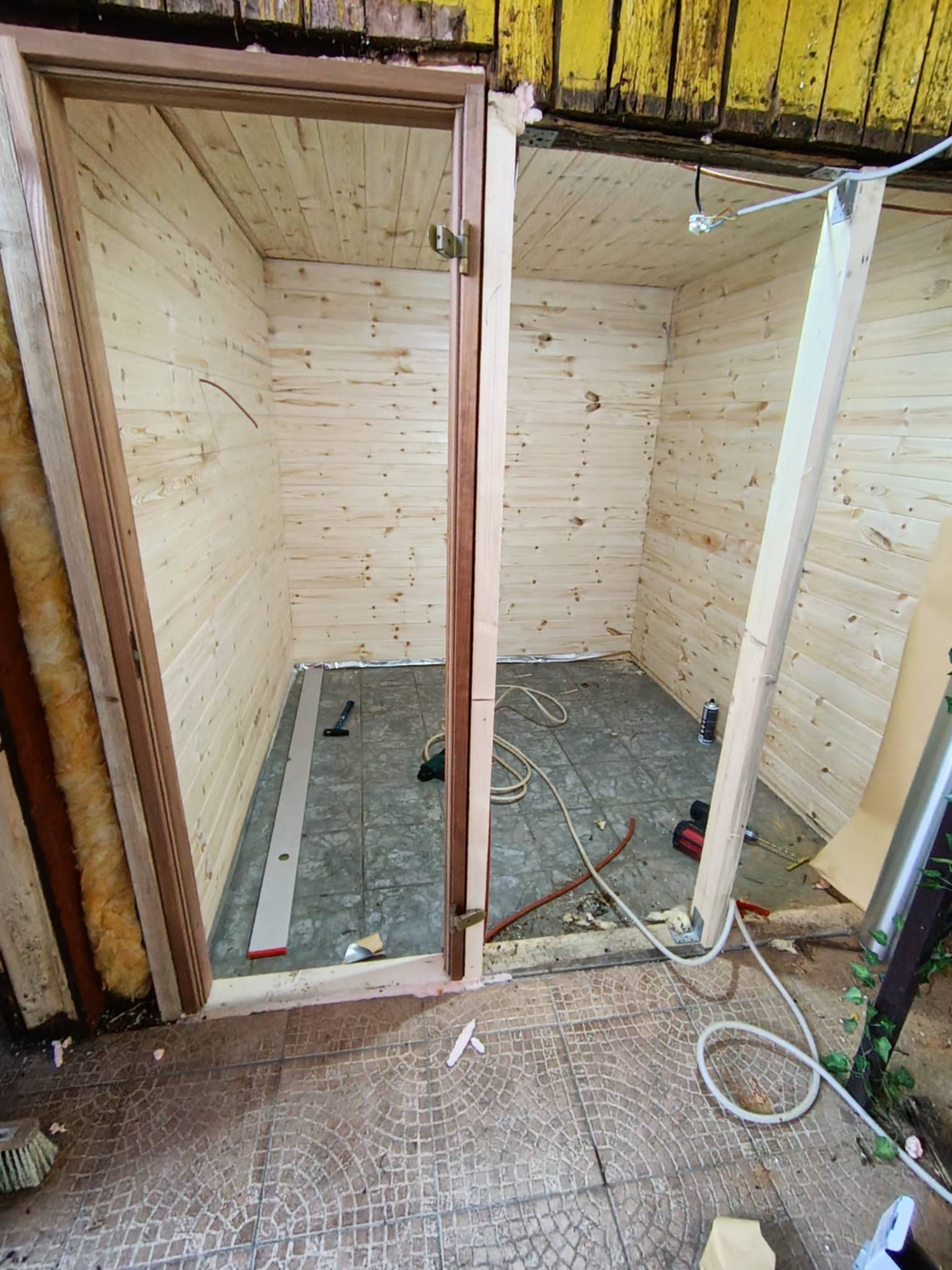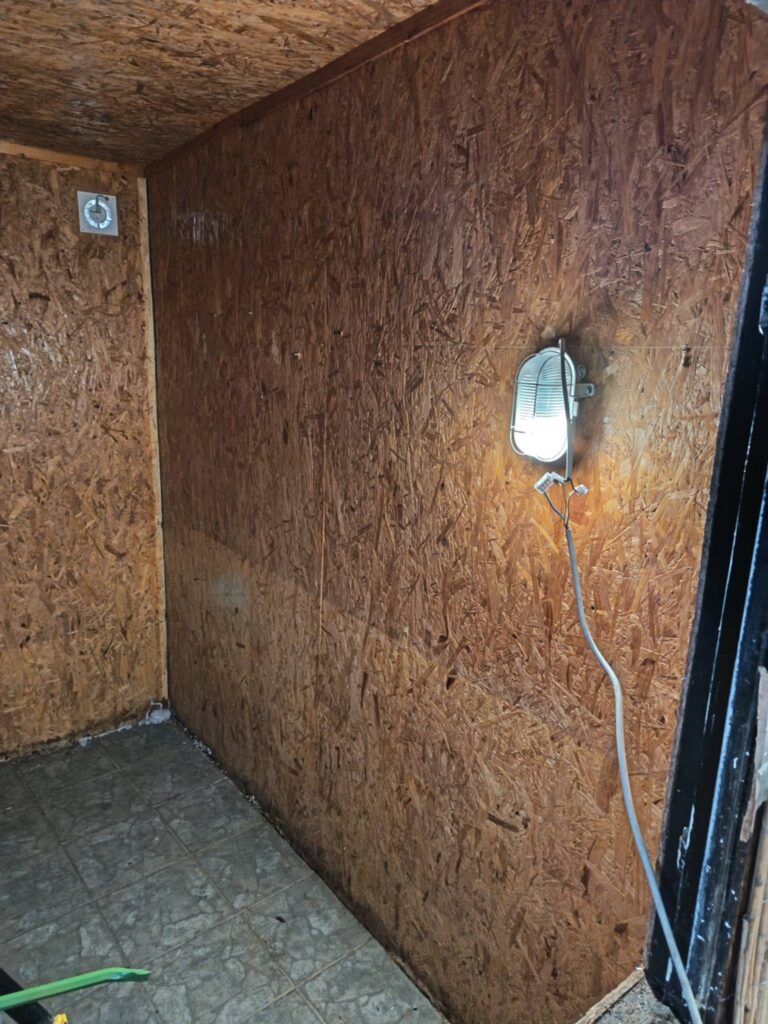 În imagine se vede interiorul unei saune confortabile, placată cu lemn natural, cu bănci dispuse pe colț și cu suprafețe de ședere pe mai multe niveluri. Structura pereților a fost realizată cu rigidizare din plăci OSB, o soluție economică, dar în același timp stabilă și durabilă pentru întreaga cabină. Pereții sunt placați cu lambriu din molid, care prin nuanța sa deschisă creează o atmosferă naturală și primitoare. Pardoseala este realizată din scândură rindeluită, iar particularitatea ei constă în faptul că scândurile sunt tăiate pe lungime în jumătate și au muchiile rotunjite, oferind astfel un aspect unic și o mai bună ventilație a suprafeței. Soba de saună amplasată în colț, împreună cu lumina caldă și difuză, completează atmosfera relaxantă a saunei.